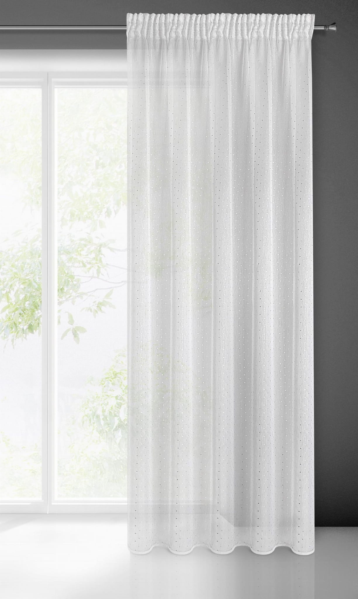 Zaprojektowana zgodnie z panującymi trendami. Dodatkowym atutem firan jest sposób zawieszenia - taśma marszcząca jest najbardziej efektownym i poręcznym rozwiązaniem.