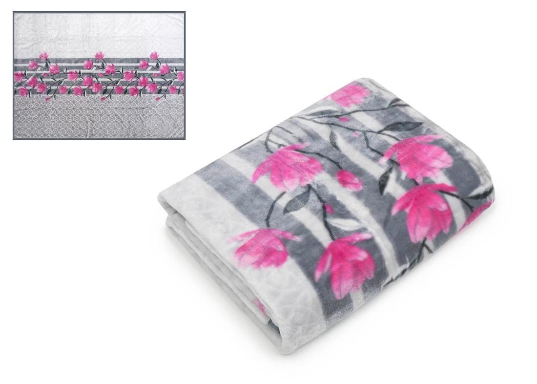 Koc z mikrofibry 160x210 Elway jasnoszary z różowymi kwiatami
