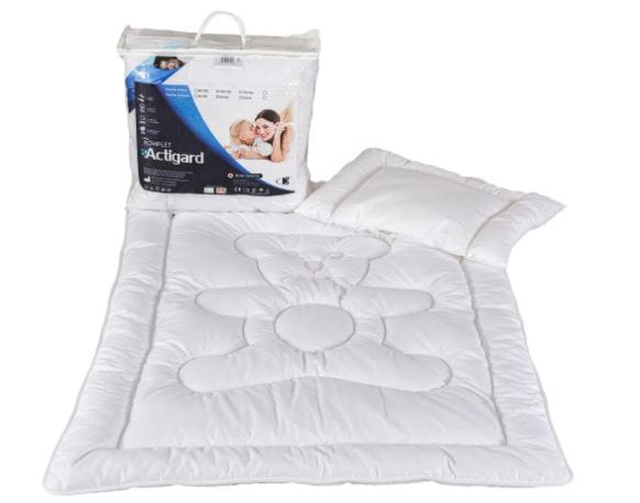 Komplet dziecięcy ActiGard®+ to zestaw, składający się z poduszki o wymiarach 40x60 cm i kołdry o wymiarach 135x100 cm. ActiGard®+ to linia wyrobów pościelowych, w której zastosowana została tkanina nasączona w substancji o tej samej nazwie. Dzięki temu posiada zdolność absorbowania i usuwania nieprzyjemnych zapachów. Przeciwdziała zarazem rozwojowi mikroorganizmów, roztoczy kurzu domowego, grzybów oraz pleśni. Wyrób kryje w sobie jednocześnie tajemnicę charakterystycznego zapachu, który zapewnia uczucie relaksu w najbliższym otoczeniu. Uprzyjemnia swoim użytkownikom chwile odpoczynku.