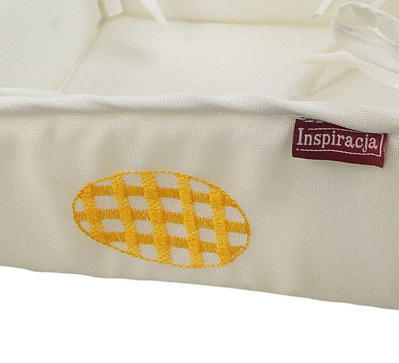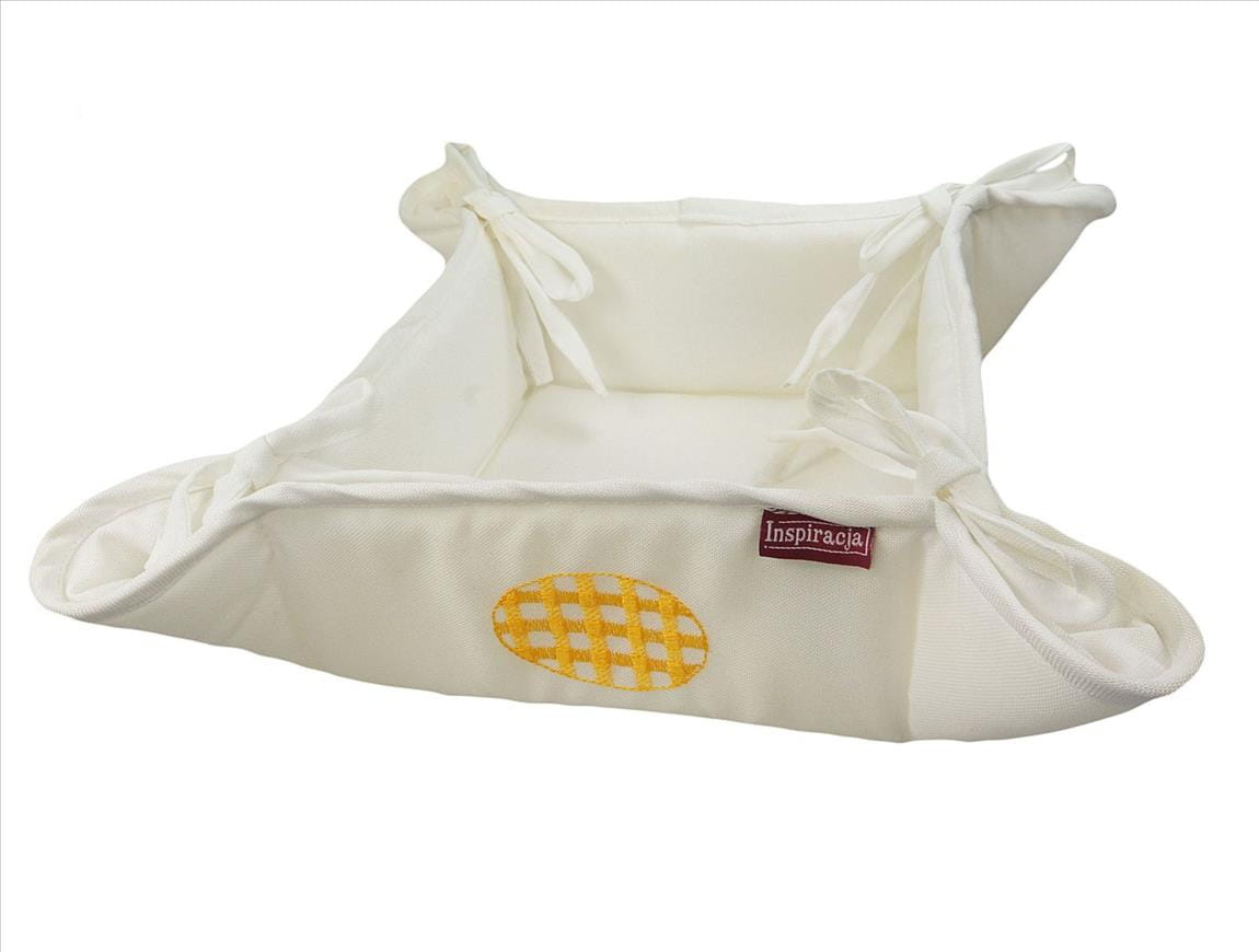 Dekoracyjny koszyczek na pieczywo, serwetki lub inne produkty. Koszyk został wypełniony specjalnym elastycznym wkładem. Składany koszyczek na chleb, bułki wykonany został z duża starannością o detale, oczym świadczą pięknie przyozdobione brzegi koszyczka . Chlebak oprócz przydatności w kuchni z pewnością doskonale sprawdzi się jako element dekoracyjny. Posiada usztywniane ścianki. Zawiązywany na rogach na troczki. Wykonany starannie z dbałością o najmniejszy szczegół. Chlebak jest nie tylko przydatny podczas serwowania posiłków, ale także będzie uroczą dekoracją każdego świątecznego Wielkanocnego stołu.