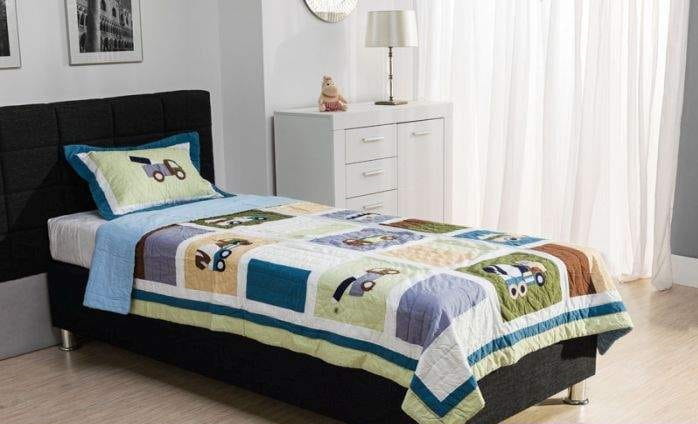 Narzuta na łóżko do dziecinnego pokoju w rozmiarze 145X220 + poszewka na poduszkę w rozmiarze 50x70 wykonanej z tkaniny w dotyku podobnej do bawełny, zdobionej gęstym pikowaniem .