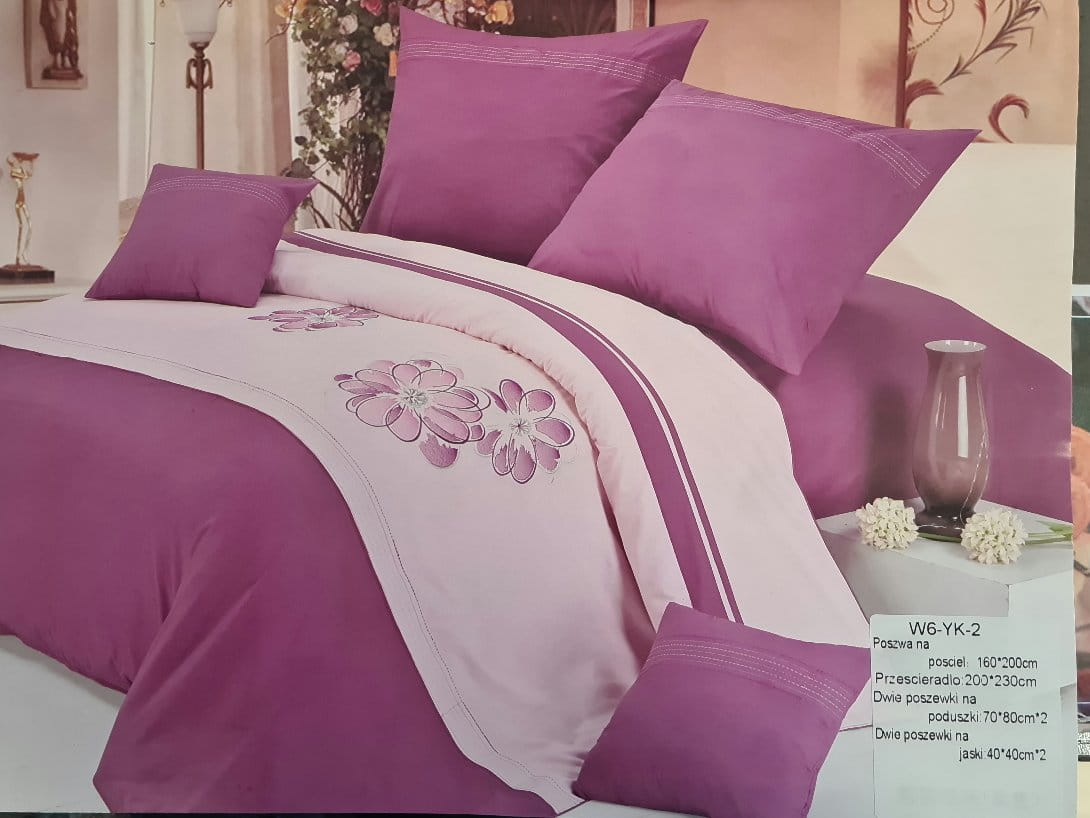Zestaw bawełnianej pościeli z haftem. Komplet składa się z poszwy na kołdrę 160x200, dwóch poszewek na poduszki 70x80, prześcieradła tradycyjnego bez gumki 200x230 oraz dwóch poszewek na jaśki 40x40