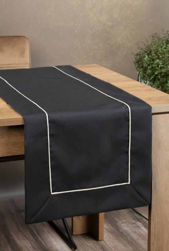 Bieżnik z srebrną lamówką szerokość: 40 cm, długość: 180 cm, kolor: czarny, Gramatura: 190 GSM, Skład: 100% poliester